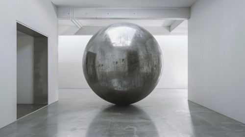 a huge concrete sphere broken and sqweezed in a door entarance, large minimal and clean studio, the sphere is larger than the door, --ar 16:9 --style raw --v 6.0