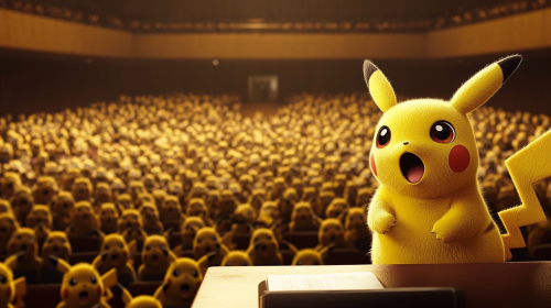a plastic toy diorama of a Pikachu looking very nervous as he gives a speech in front of a large audience in an auditorium. The auditorium is full of Pikachus. --ar 16:9