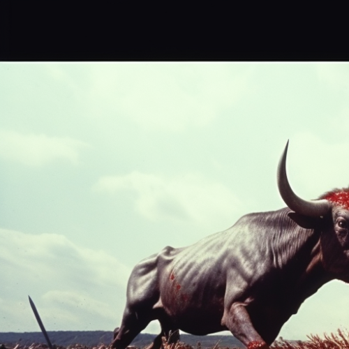 **Jesus Christ sacrificing a cow in the field, holding a trident in his hand, in the background a horde of hungry and dirty people running towards him, In the sky Satan peeks out, scene from a B movie, 1982, apocalypse, dvd Quality, 35mm film-grain