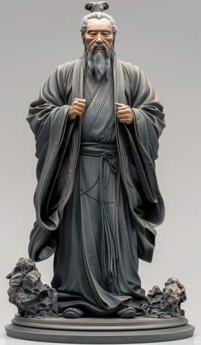 Confucius, long beard, wearing ancient robes, traditional topknot, full-body front view, mouth closed, in deep thought.White background. Vector art.photo-realistic, HD. --ar 52:89 --s 750 --v 6.0 --style raw
