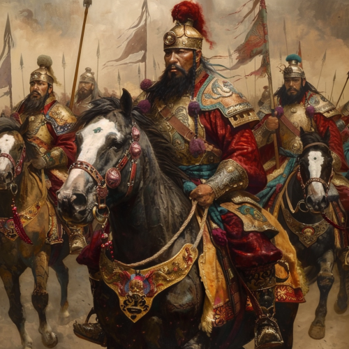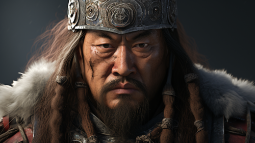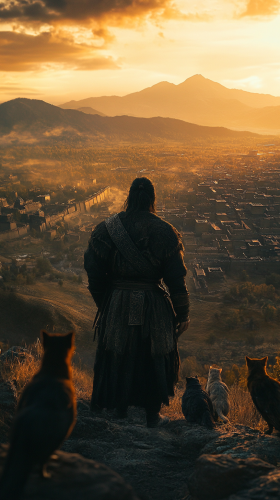 STYLE: Cinematic Shot | GENRE: historical drama | EMOTION: cunning, anticipation | SCENE: Genghis Khan stands confidently on a hill overlooking the fortified city of Balohia, his eyes fixed on the distant walls. Beside him, an army of cats and birds awaits his command, while his generals exchange uneasy glances. The sun sets, casting a warm, strategic glow over his calm yet intense expression. | TAGS: 8k, warm sunset lighting, historical realism, dramatic composition, tense atmosphere, immersive setting | TIME: Sunset | LOCATION TYPE: Overlooking a fortified city | CINEMATOGRAPHER: Emmanuel Lubezki | --ar 9:16