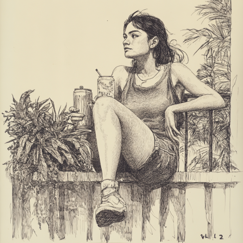 Illustrate a young woman sitting on a narrow balcony, one leg extended over the railing, holding a can in one hand and a cigarette in the other. She gazes off into the distance with a sense of detached contemplation. Capture the scene using intricate cross-hatching to highlight the textures in her dark attire and the details of the plants beside her, emphasizing shadows to create a moody, introspective atmosphere. The character should have simplified, almost melancholic facial features, conveying an air of quiet introspection. Use a minimal background to enhance the feeling of isolation, and add a symbolic motif such as a small bird perched nearby or faintly in the background, suggesting hidden emotions or unspoken thoughts.