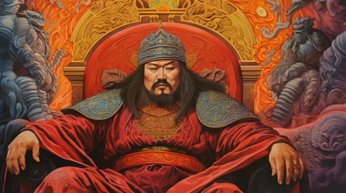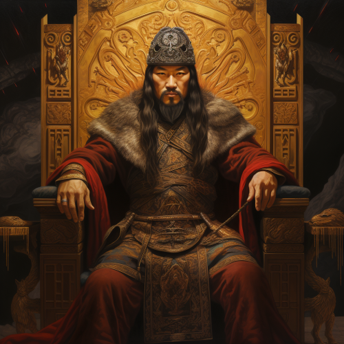 genghis khan in deep thinking in his throne, coloured pencil style --ar 16:9