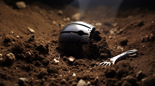 a small black grenade is next to a hole in the soil, in the style of cybermysticpunk, photo-realistic drawings, bunnycore, handheld, cobra, letterboxing, nyc explosion coverage --ar 128:71