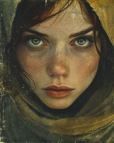 A lithograph portrait by Tolkien artist Alan Lee, of a woman who is exhausted after being in a riot. Her face is marred by soot and tears. She is a plain, intelligent 37-year old weathered Polish woman in the year 1630. She has piercing hazel eyes and is not attractive. She has short chestnut hair with flecks of grey. Her sun-kissed complexion speaks of long hours spent outdoors. --ar 4:5 --v 6.0 --s 750