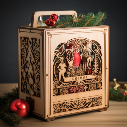 AI, please help me create a Christmas-themed beer crate design using laser-engraved wood. The design should incorporate festive elements and space for holding bottles. Additionally, I’d like to add colored accents to the wood. Can you generate a visual representation of this idea
