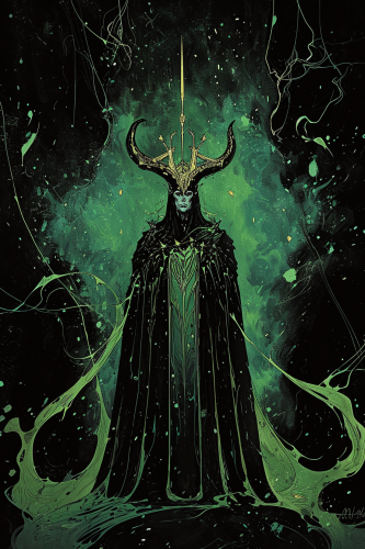 (Moebius art style, 80's scifi fantasy magazine art, professional illustration, hyper-details:2), stunning image of the king of stories standing slender in the void black and green robes with horned crown, eerie background (dark black and glimpses of a green nebula and story threads), cinematic composition --no fake CGI --chaos 3 --ar 2:3 --v 6.0