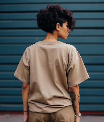 Create an illustration of a short-sleeve shirt design with both front and back views, similar to a technical flat drawing. The shirt should feature a large abstract round and square pattern with intersecting lines and visible stitching details. Ensure that the entire shirt is shown clearly, including both sleeves on the front and back views, without any parts getting cut off. The illustration should be centered with a clear white border around it to ensure all edges of the shirt are visible. The background should be plain white to provide a clean and unobstructed view of the shirt designs.