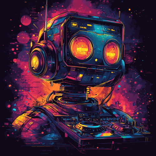 Craft a retro-style t-shirt graphic reminiscent of '80s synth-pop, featuring neon-colored geometric shapes and a futuristic robot DJ in the center. --q 2 --s 750