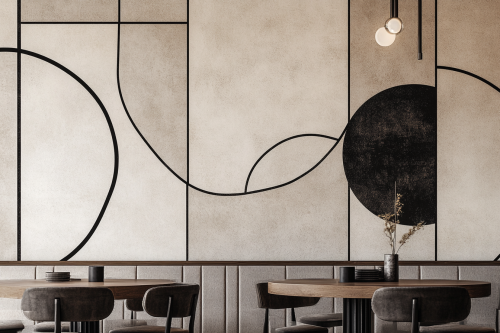 A modern abstract wall pattern featuring large geometric shapes with curved edges, outlined in bold black lines. The interiors of the shapes are filled with a muted beige tone, creating a sophisticated and minimalistic design. The pattern is both contemporary and elegant, perfect for interior decor, with subtle texture and soft shading. hd quality, modern and abstract style --ar 3:2 --v 6.1