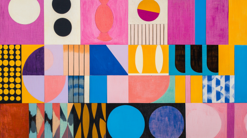 This image features a geometric pattern that combines abstract shapes such as circles, triangles, and rectangles. The color scheme primarily consists of vivid pinks, blues, yellows, oranges, and purples. The design is arranged in a grid, with each section containing different combinations of shapes and patterns, such as stripes, solid blocks, and overlapping circles. --ar 16:9