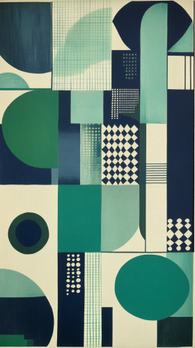This image features a geometric pattern with a mix of abstract shapes, including circles, triangles, and rectangles. The color scheme consists primarily of green, teal, navy blue, and off-white. The design is arranged in a grid-like structure, with each section containing different combinations of shapes and patterns, such as stripes, solid blocks, and overlapping circles. This composition creates a visually dynamic, retro-inspired look, with a playful yet organized feel. The use of contrasting colors and simple geometric shapes gives the image a modern, minimalist aesthetic. --ar 9:16