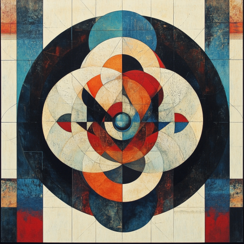 A surreal geometric world where everything is composed of perfect shapes, governed by a flying god. This god connects all elements through precise tangent operations, creating an infinite network of circles, semicircles, and other geometric forms that interlock and touch in harmony. The god majestically floats at the center, controlling and aligning each shape with divine precision. Color palette: Red, Blue, Black, Salad, Sky Blue.