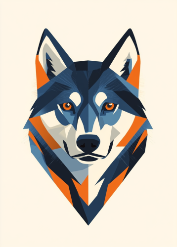 Vector flat illustration of a huskie head, in a simple minimalistic style with geometric shapes and lines, on a light background. The digital art features contrasting shadows, a color scheme in shades of blue and orange, and a symmetrical composition with a retro design style. There are no shading details, and it is a vector graphic. --ar 23:32