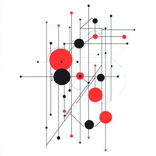 A minimalist vector illustration of interconnected elements forming an abstract representation, rendered in flat colors with clean lines and geometric shapes. The design includes simple black outlines for the connections between different objects like circles or squares on a white background. It has bold red accents that highlight key features to create visual interest. This style is reminiscent of modern graphic design and can be used as print art, poster artwork, social media avatar, logo, and more.