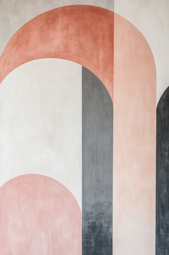 Design a striking minimalist abstract artwork that uses soft, muted tones of blush pink, warm terracotta, cream, and deep grey. Incorporate geometric shapes like arches and angular forms that create a sense of depth and perspective through the interplay of light and shadow. The composition should evoke calmness and balance, with a clean, modern aesthetic. Focus on subtle texture and tonal gradation to create a harmonious yet dynamic visual experience, perfect for contemporary interior spaces. --ar 2:3