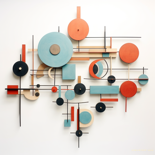 Create a kinetic art piece featuring an array of floating geometric shapes reminiscent of machine parts, rendered in a palette of earth tones accented with sky blue and coral red