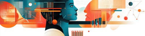 A mural design depicting the deep connection between humans and computer technologies through geometric illustrations in a flat design style. The Tangerine Dream color palette infuses warmth, while abstract digital art techniques add depth. Created Using: Geometric illustration, flat design, Tangerine Dream color, abstract digital art --ar 103:26