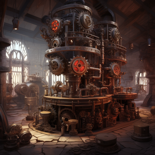 a dwarven brewery in the style of steam punk cogs and gears. Fantasy art