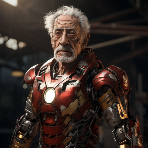 100 year old geriatric iron Man, full body, rusted iron Man suit, character concept, intricate clothing and cape, with assistive walker, no muscles ,hunched Forward ,cinematic lighting, deep facial wrinkles from old age,cinematic atmosphere, 8k octane render, unreal engine 5