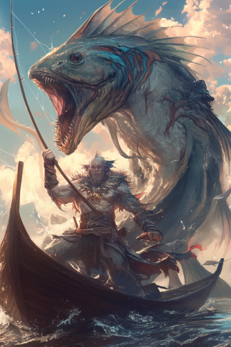 4K quality, digital drawing mode, medieval fantasy-themed male character with a fishing pole, sitting in a small woden boat, A fish leaping out of the water, leviathan monster, fantasy lake background, determined and fierce expression, full body, dynamic pose, life size, perfect anatomy, detailed skin texture, full HD, 4K, HDR, perfect anatomy, depth of field --ar 2:3 --niji 6