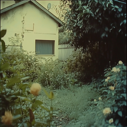 A still image from a 1999 home tape. the American middle class village. the garden. noisy Videotape VHS quality. camcorder video tape, old camera phone style. bad quality. Scene from we need a pooh.
