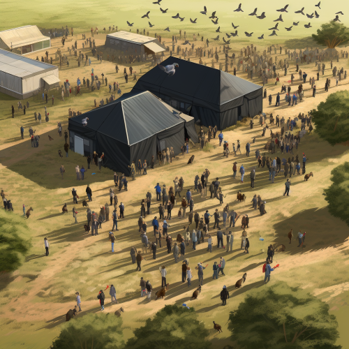 A birds view of a French pasture. There is a small techno rave going on. People are wearing black. Some people are dancen. Photorealistic. --style raw