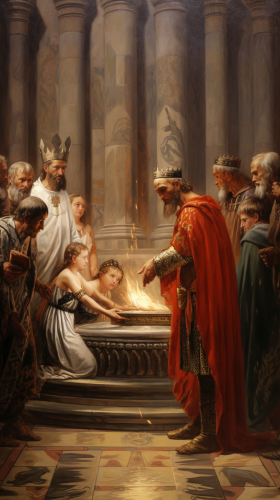 REALISTIC PAINTING OF THE BAPTISM of a king of a Germanic tribe IN REIMS CATHEDRAL IN FRANCE IN 500 AD. --ar 9:16