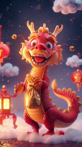 Pixar animation style, cute Chinese dragon, clean background, one hand holding a money bag, big gold necklace, lantern, auspicious clouds, 3D, smooth, body centered, hard light, strong light, c4d, 32k, HD quality --ar 9:16 --v 6.0