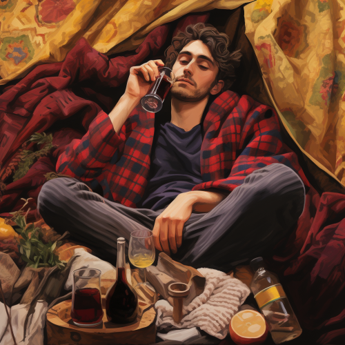 poster design with a ghost drinking a glass of wine outdoors in the daytime --niji 5 --ar 3:4