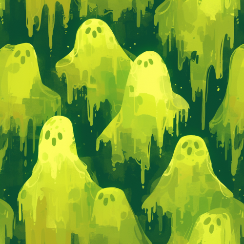 create a playful yet spooky neon greens drawn poster of dj turn tables with a playfully dead cartoon lizard on one of the disks. show the ghost of the lizard with dj headphones on floating above with musical notes all around.