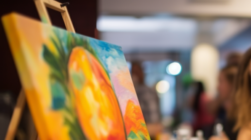 fun and happy art workshop in a social gallery in aruba with foods and drinks --ar 16:9