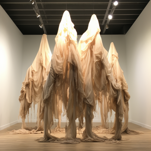 an modern art gallery. Two Ghostbusters running through the gallery. They trying to catch a evil looking ghost. Make it look realistic and show the ghost the ghostbusters are hunting.