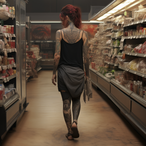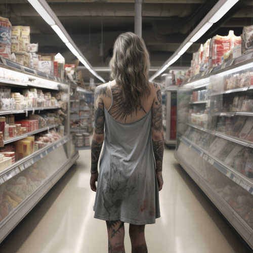 hyperrealistic; bright light; a deserted supermarket aisle; a gaunt, barefoot woman stands in the middle of it, back to us; her skin is mottled and grey; she has a faded tattoo of a rose on her bony shoulder