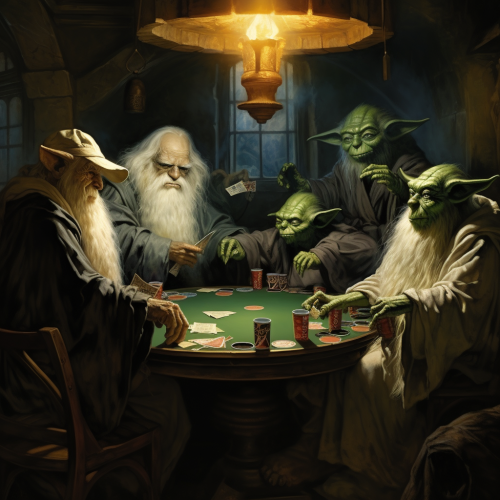 yoda, darth vader, spawk, gandalf, sauron, playing poker, drinking, drunk