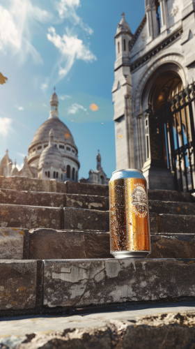 a 10m high beer can on the steps of the sacre coeur, sunny day, hyperrealistic, nikon, 8k, --ar 9:16