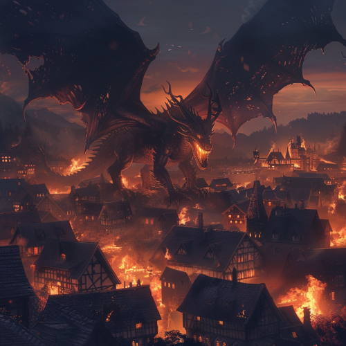 a giant dragon with its wings open, standing on top of a mediaval town on fire, at night, digital art