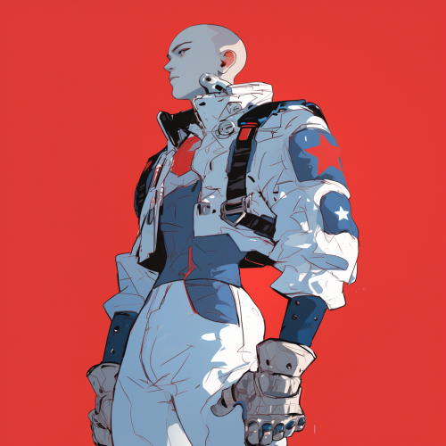 jamie hewlett art style, early 20s late teens male, who is a space junk mechanic, small build with shaved head short, in a mostly white and blue suit with small red accents, overalls shoulder pads and knee pads --niji 6