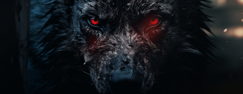 authentic and cinematic photography, a mad black wolf in the middle with half red and half blue face, amazing light, very realistics textures, skin realistic , ultra - detailed photography, immersive visual shot taken with a hasselbald professional camera --v 5.2 --ar 31:12