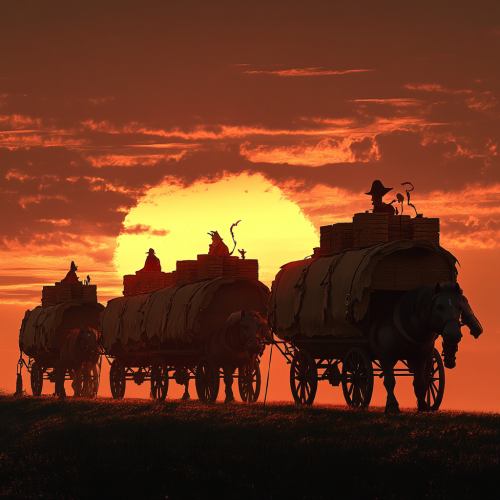silhoette of a medieval caravan of seven open wagons pulled by horses, full of crates, an ogre walking with a gnome on his shoulders in the back, sunset in the background --v 6.1