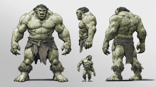 question:concept sketch of a stylized 3d brute ogre, cloth cave-man clothing, muscular body, green skin, angry eyes, inflated nose, angry and scary, character turn-around sheet --ar 16:9