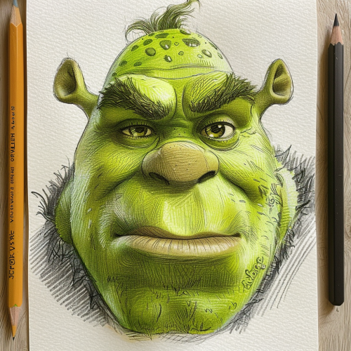 ogre is holding a gift, cartoon style, easy paint, green pencil drawing