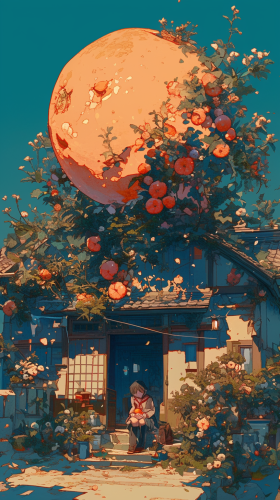 90s anime art style of giant peach growing in garden of oppressive home in dreary england --ar 9:16 --s 250 --niji 6