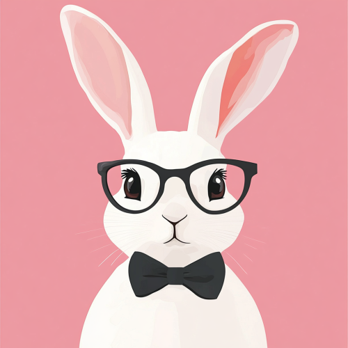A bunny with a bow tie and glasses, set on a pink background, in a flat illustration style with clean lines. This artwork has a minimalist cartoon-style aesthetic using vector graphics and a simple design.