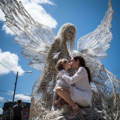 Glastonbury angel sculpture covered in white lace cloth, large wings also covered in lace, expression between girl and adult, ennui and cheek cane, bright mood, light shining