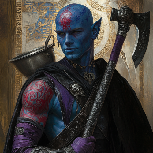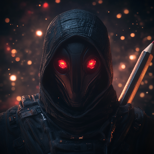 hyperrealistic 3D giant hooded character with red evil eyes overstanding the world with a huge pencil and a dark background with space lights in the background