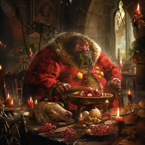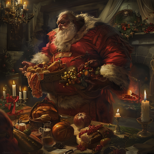 a great giant of a man in red fur robes with an equally great cornucopia of food and drink in a hall with a fire place with candles and writhes adorned all about --s 50 --v 6.0 --style raw