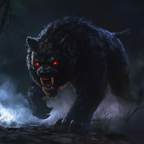 photo realistic. A Shadowclaw Titan. A massive giant with pitch-black fur and glowing red eyes, resembling a cross between a grizzly bear, a panther, and a humanoid figure. It prowls the night, silently hunting its prey.