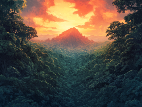 A vast exotic temperate forest. The trees are massive, old, thick-stemmed and very wide canopy, and the forest is seemingly impenetrable, with no clearings, and flat. The forest has a mystical energy about it. A very small mountain appears in the center. The mountain is colored red by the setting sun, as are the clouds, but the trees are in sunlight. Fantasy RPG setting, wide angle, detailed. Wild nature, dramatic atmosphere. --ar 4:3 --v 6.1
