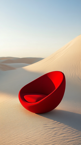 A single elegant red chair centered in the middle of a desert, with soft natural lighting creating a serene and quiet atmosphere. The bright red contrasts beautifully with the white, the chair is modern yet sophisticated, designed for an important guest, and the scene feels tranquil and inviting. --ar 9:16